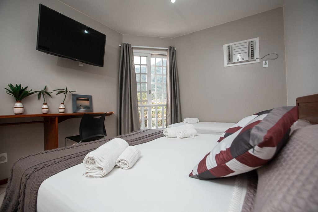 Possui 01 cama de casal, 01 cama de solteiro, ar condicionado, frigobar, tv smart 43 polegadas, wi fi e banheiro privativo.